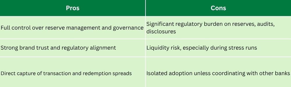 In this model, a bank acts as the issuer or co-issuer of a stablecoin, backed 1:1 by its own reserves in fiat or short-term assets. The bank also provides custody, redemption, and minting services.